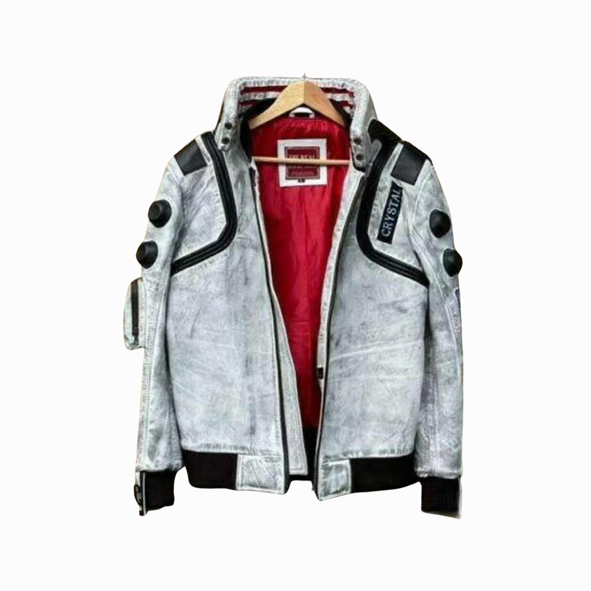 Cyberpunk 2077 White Waxed Leather Jacket – LED Collar, Samurai Embroidery